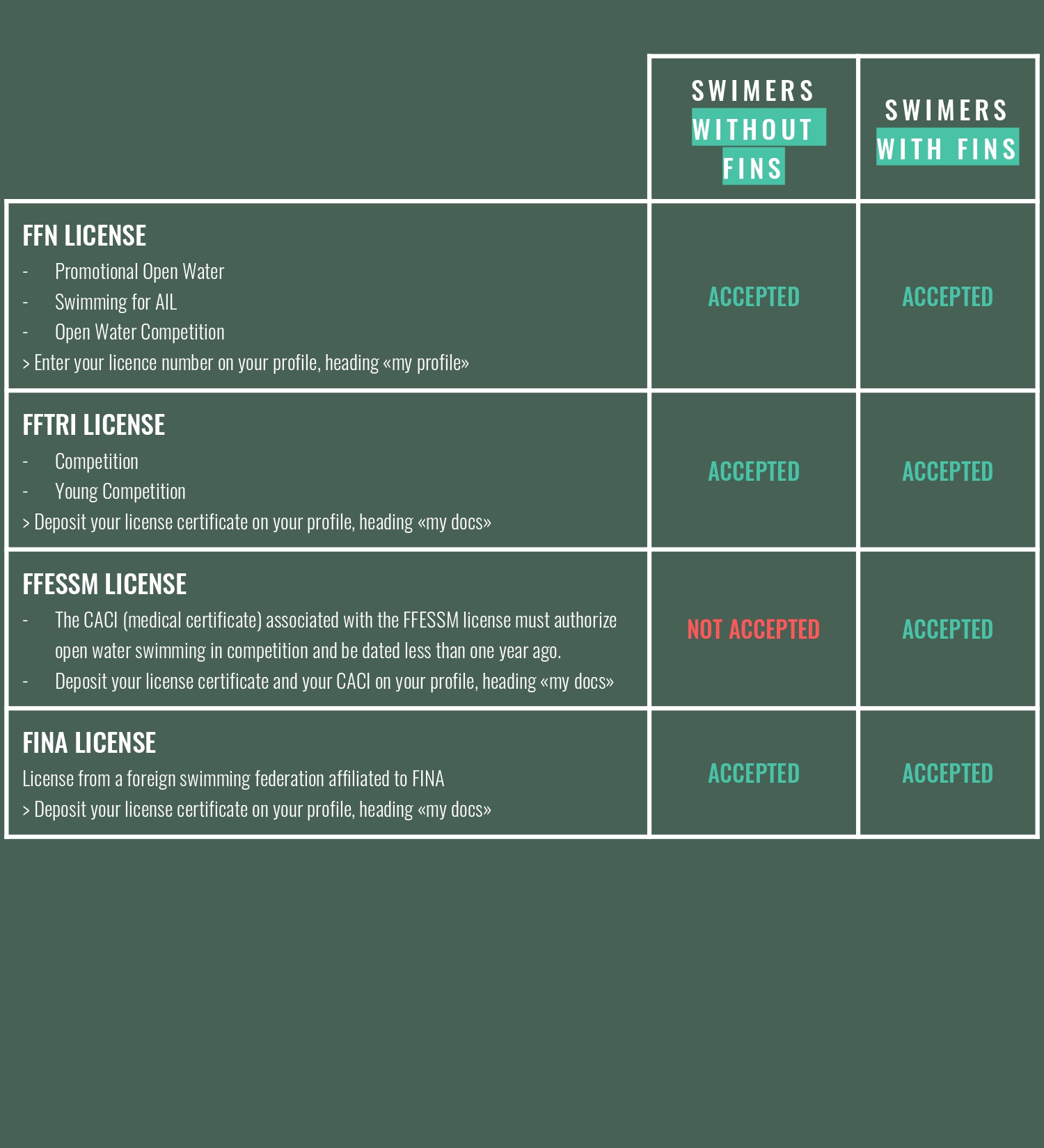 To validate your participation, it is MANDATORY AND ESSENTIAL to download BEFORE THE 01/08/2026 on your profile a license (depending on your situation: swimmer WITH or WITHOUT fins).