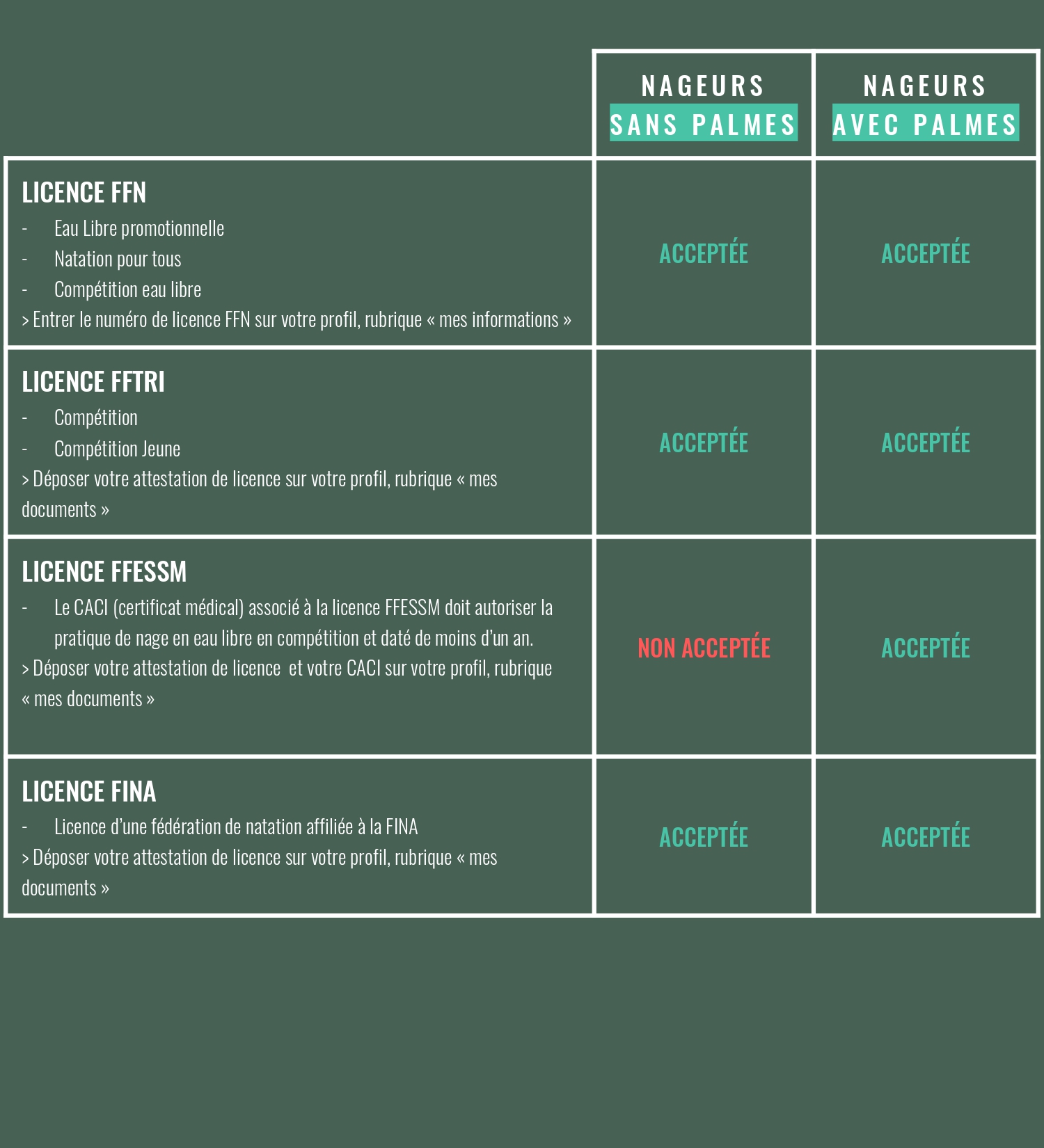 Pour valider votre participation, il est OBLIGATOIRE ET INDISPENSABLE de télécharger AVANT LE 01/08/2026 sur votre profil une licence (en fonction de votre situation : nageur AVEC ou SANS palmes).