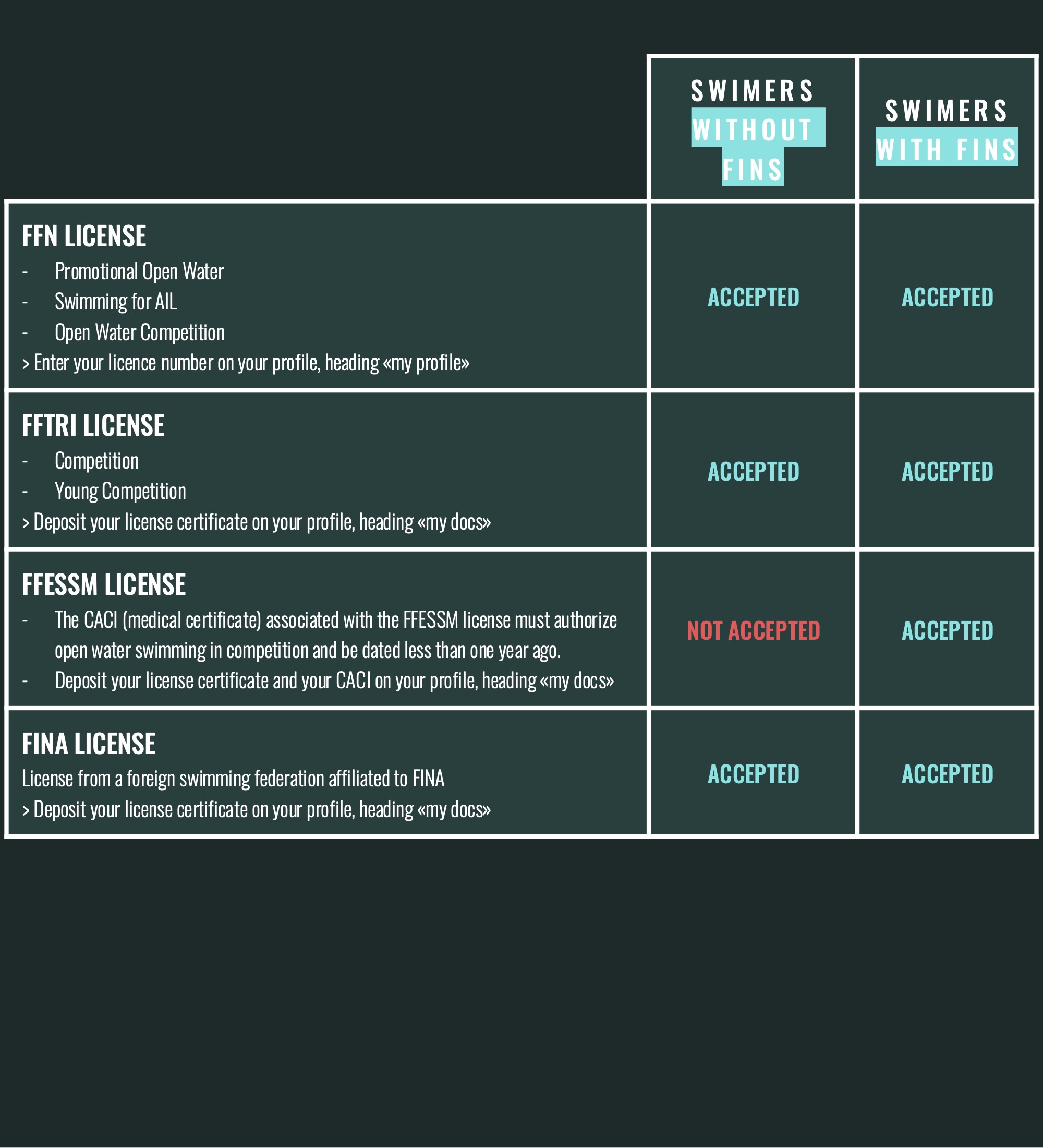 To validate your participation, it is MANDATORY AND ESSENTIAL to download BEFORE THE 01/05/2026 on your profile a license (depending on your situation: swimmer WITH or WITHOUT fins).