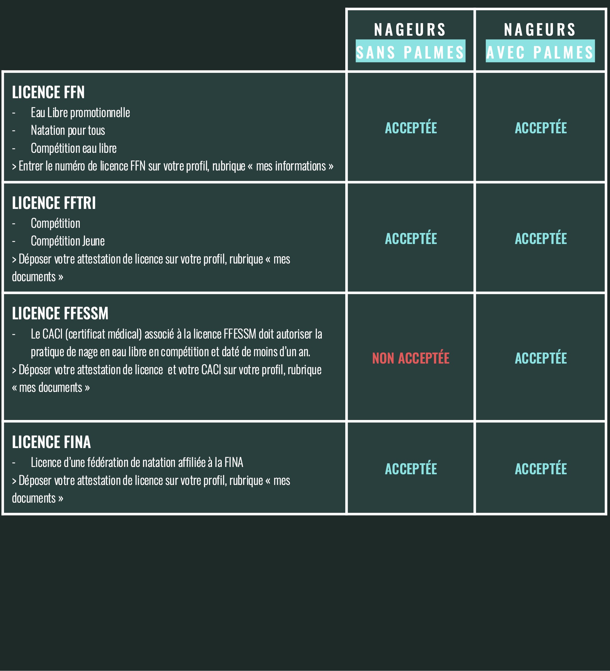 Pour valider votre participation, il est OBLIGATOIRE ET INDISPENSABLE de télécharger AVANT LE 01/05/2026 sur votre profil une licence (en fonction de votre situation : nageur AVEC ou SANS palmes).